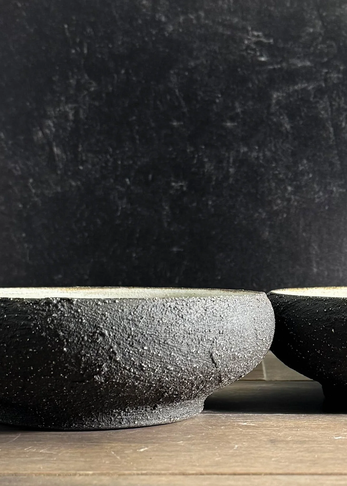 Black sands entree bowls are thrown from a dark clay body, trimmed to an elegant curve, and decorated with a heavily textured black slip. Specks of white can be seen throughout the texture, which is inspired by Iceland’s black sand beaches. They have been sanded to a finish that begs to be touched.